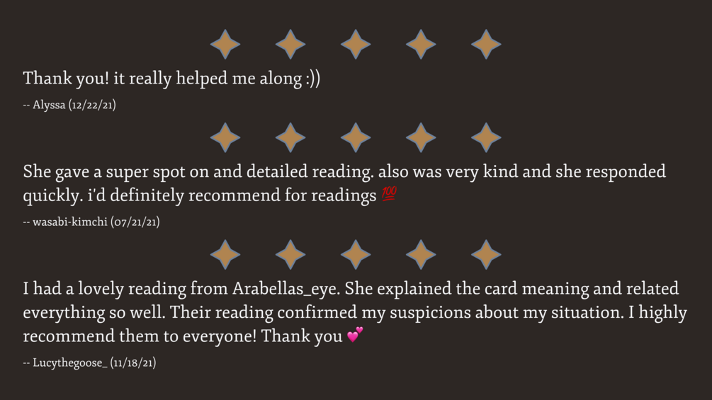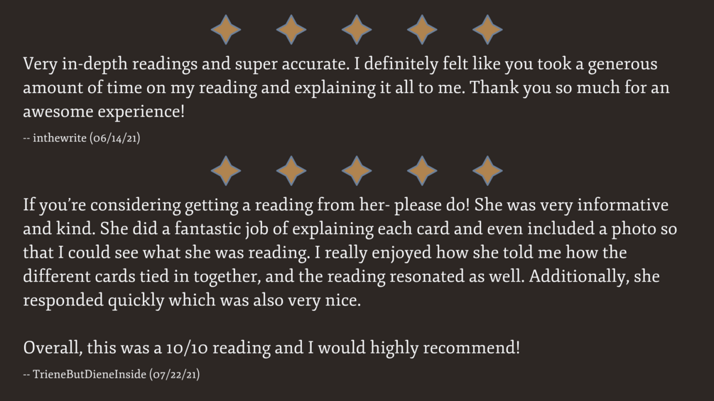 Tarot readings are a divination practice that provide wisdom and guidance through tarot cards and tarot card spreads. As an experienced intuitive tarot reader, I will use my skills to give you an intuitive, detailed, and accurate tarot reading. Tarot readings are an amazing way to learn more about your life and path. My tarot card readings will give you clarity about your past, your present and the best way forward for your future.